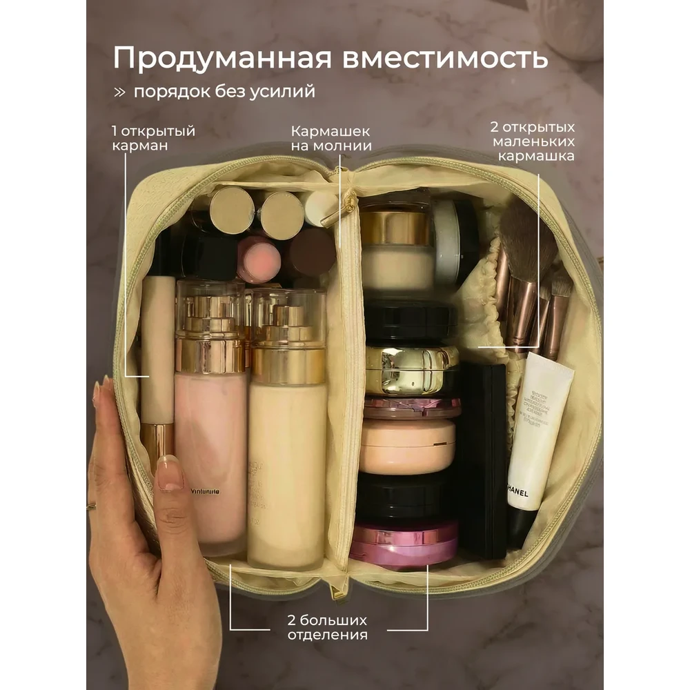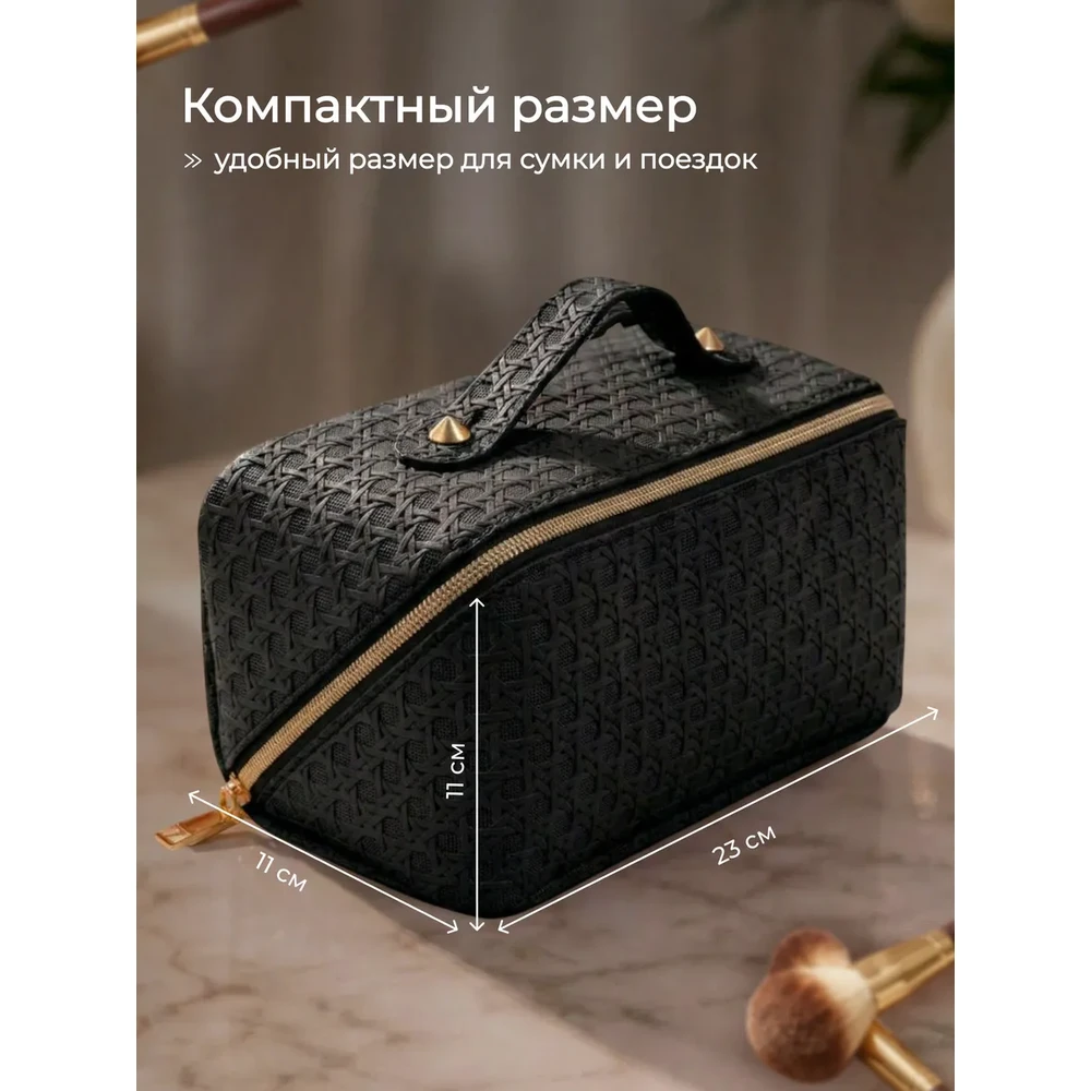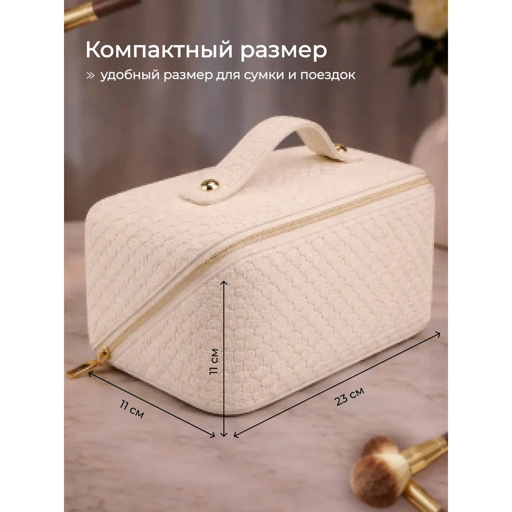 Дорожная большая косметичка‑органайзер для женщин — практичный бьюти‑кейс с продуманной организацией пространства. Вмещает полный набор косметики: от базовых средств до аксессуаров. Компактно складывается, легко помещается в сумку или чемодан. Подходит для путешествий, спортзала, командировок и ежедневного использования.